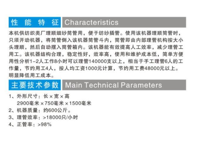 一、用工分析 1-2人工作8小時可以理管140000支以上,相當(dāng)于手工理管6人的工作量,節(jié)約用工4人,按人均工資1000元計算,節(jié)約用工費(fèi)48000元以上。明顯降低用工成本 二、工作原理 本設(shè)備可將雜亂無章的紗管,經(jīng)提升皮帶輸送至初整區(qū)。初整區(qū)的分隔板將紗管調(diào)整成紗管的軸線與運(yùn)動方西接******行的狀態(tài),再經(jīng)橡膠傳動輪將紗管輸送至圓盤分理輪。利用分理輪分離盤間的間隙,迫使紗管大頭朝上小頭朝下,并隨分離輪做圓周運(yùn)動。借助紗管的離心力與剝離叉的共同作用,使紗管脫離分理輪并進(jìn)入水平輸送皮帶,由水平輸送皮帶將紗管送至管斗。 三、結(jié)構(gòu)特點 1、中間橡膠傳送輪,將落下紗管的自身運(yùn)動能量轉(zhuǎn)換并導(dǎo)向使其快速的進(jìn)入分理輪,提有效果。 2、中間橡膠傳輸輪較其他傳輸方式的使用,可使整機(jī)外型尺寸縮小,減小占地面積。 3、橡膠傳輸輪和分隔板上的膠條以及合成材料作成的分理輪在紗管被整理的同時對筒管進(jìn)行保護(hù),防止紗管表面被損傷。 4、中間橡膠傳輸輪已申請了******zl****保護(hù)。 四、使用要點 1、運(yùn)行前接通符合要求的電源,確認(rèn)正反轉(zhuǎn)和接地可靠有效。 2、啟動電源,檢查各運(yùn)轉(zhuǎn)部件的狀態(tài),有無碰卡現(xiàn)象。 3、檢查各部緊固螺栓和螺母,檢查傳送皮帶有無偏跑,若跑偏利用調(diào)整螺釘調(diào)整。 4、調(diào)整管庫的容量和管斗支架的高低,至所需要的合理位置。 5、建議管斗的寬度為220mm管斗的深度為200mm 6、若需整理緯紗管,需更換設(shè)備分理輪。 五、產(chǎn)品規(guī)格 外形尺寸長×寬×高:1820mm×880mm×1010mm設(shè)備重量:810kg設(shè)備耗能電機(jī)功率:1.1kw工作電壓:380V 六、安裝本設(shè)備 安裝于較平整的地面上,要求四腳著地,無需要地腳螺栓固定。 七、工作效率:18000根/小時 可選配液壓自動上管機(jī).亂管自動倒進(jìn)機(jī)器后理管! |